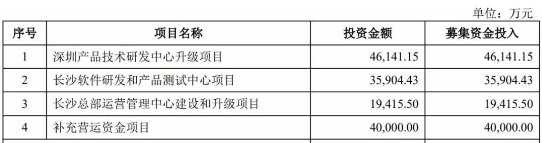 融资主要用于深圳产品技术研发中心升级项目、长沙软件研发和产品测试中心项目、长沙总部运营管理中心建设和升级项目、补充营运资金项目。