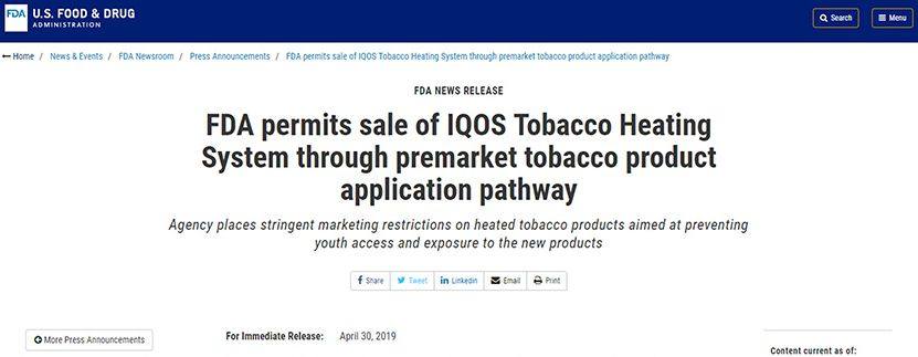 图 FDA 通过 IQOS 在美销售的新闻,截至FDA官网