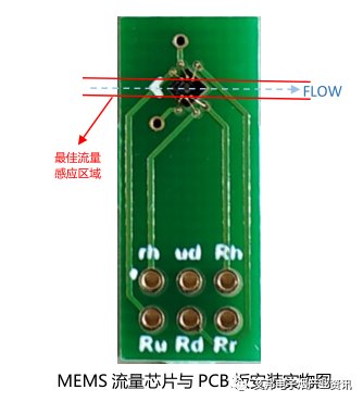 图 MEMS 流量芯片与 PCB 板安装建议以及推荐的气体流向如上图
