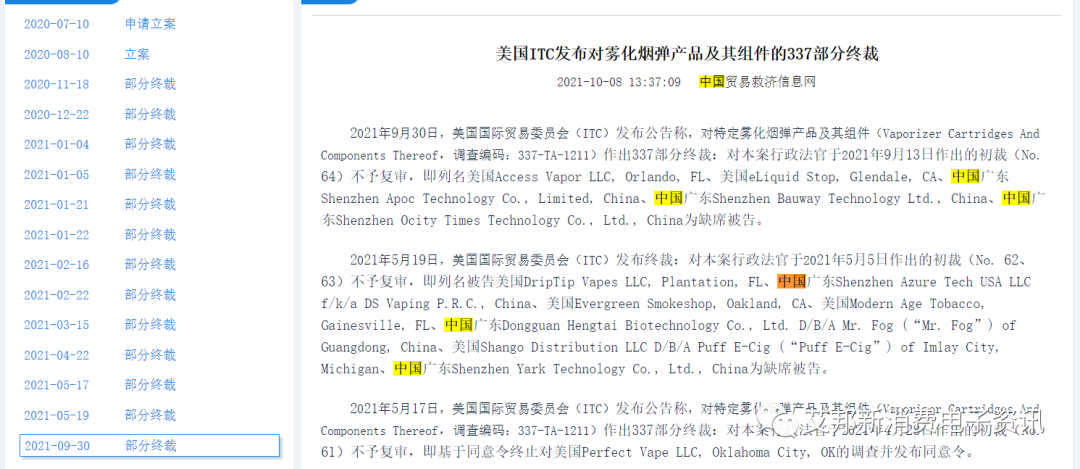此前的“337都是美国头部电子烟品牌JUUL发起,2018年和2020年先后发起过两次,其中2018年的“337”调查有5家涉案中国企业,3家缺席,2家和解,而2020年有7家涉案中国企业,6家缺席,1家撤消调查。