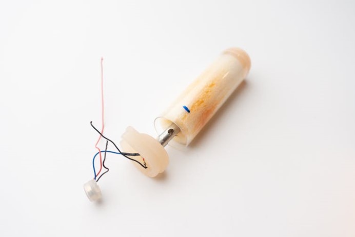 Disposable vapes contain an absorbent foam material saturated with e-liquid and contained in a plastic tube with silicone endcaps.