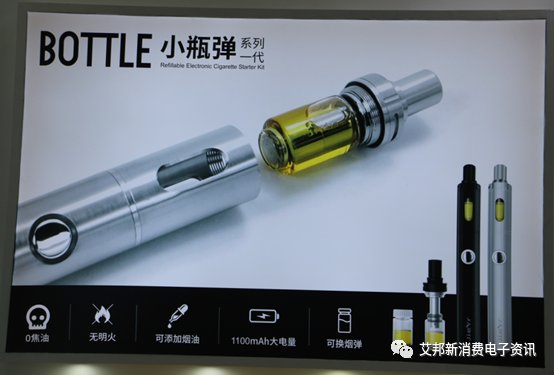 小瓶弹电子烟:据海报以及现场了解来看,这款电子烟可换烟油,但特点是从上面拧开,抽出雾化芯进行添加烟油。